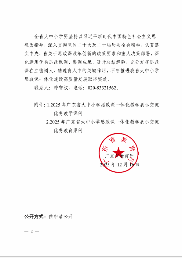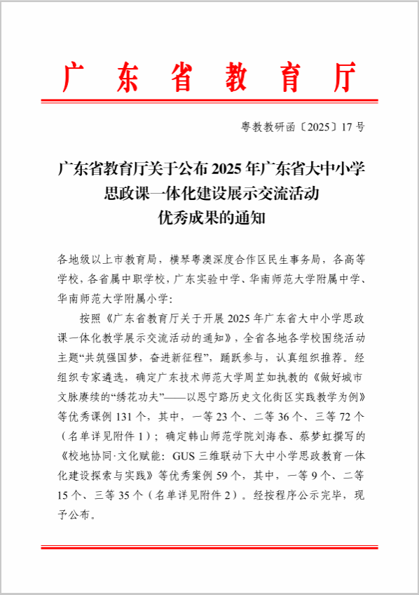 12月16日,2025年广东省大中小学思政课一体化教学展示交流活动结果揭晓,公司太阳集团tyc539macau专任教师郭小娜撰写的《“三位一体、四方联动、开放共享”大中小学思政课一体化模式的构建与实践——以广东省大中小学思政课一体化共同体为例》荣获优秀教育案例三等奖。