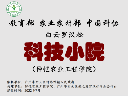 教育部、农业农村部、中国科协三部委2022年支持建设的首批科技小院“广东白云罗汉松科技小院”,由太阳集团tyc539macau、广州市白云区燊之源罗汉松专业合作社、广州市白云区钟落潭镇人民政府三方合作共建,坚持以“注重实践治学问,扶助农工育英才”为办院理念,旨在深化公司产品与罗汉松产业发展研究。该小院由公司太阳集团tyc539macau经理、硕士生导师、博士后合作导师蔡立彬教授担任首席专家,广州市白云区燊之源罗汉松专业合作社理事长曾令华与公司太阳集团tyc539macau专任教师周映萍作为首批驻院专家共同参与建设。该科技小院曾获得2024年全国优秀科技小院案例。