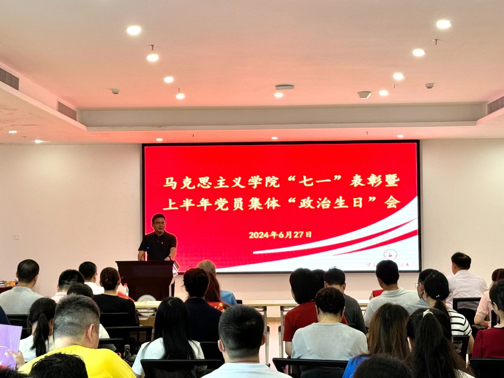 会上宣读了表彰决定,先后为先进党支部、优秀党支部书记、优秀党务工作者、优秀共产党员颁发荣誉证书,为集中过“政治生日”的党员赠送“政治生日”贺卡和学习笔记本,过“政治生日”的党员代表韩大猛老师上台发言,许“政治生日愿望”。